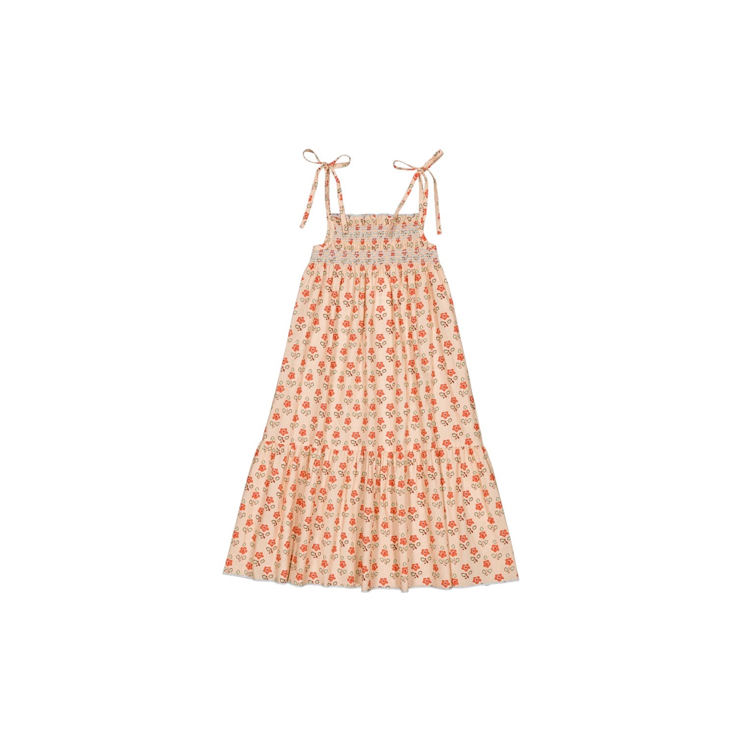長款蓬鬆連身裙,上身飾有精美刺繡的褶襉。細肩帶繫有蝴蝶結。下擺飾有大荷葉邊魚尾裙。
