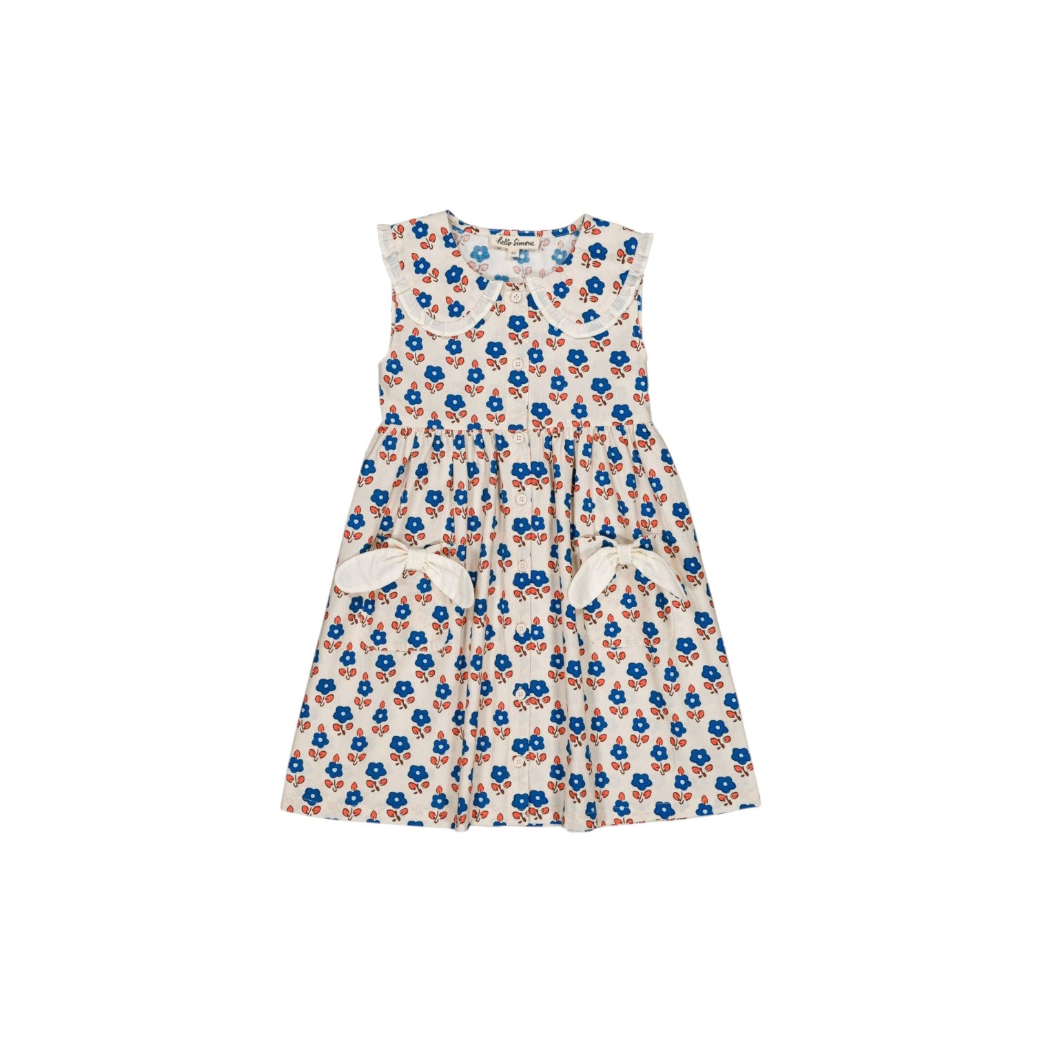 這款無袖洋裝剪裁是高腰設計,下擺呈褶皺傘狀,圓領飾有米白色小荷葉邊,口袋上點綴著別緻的白色蝴蝶結,正面排釦開扣設計。