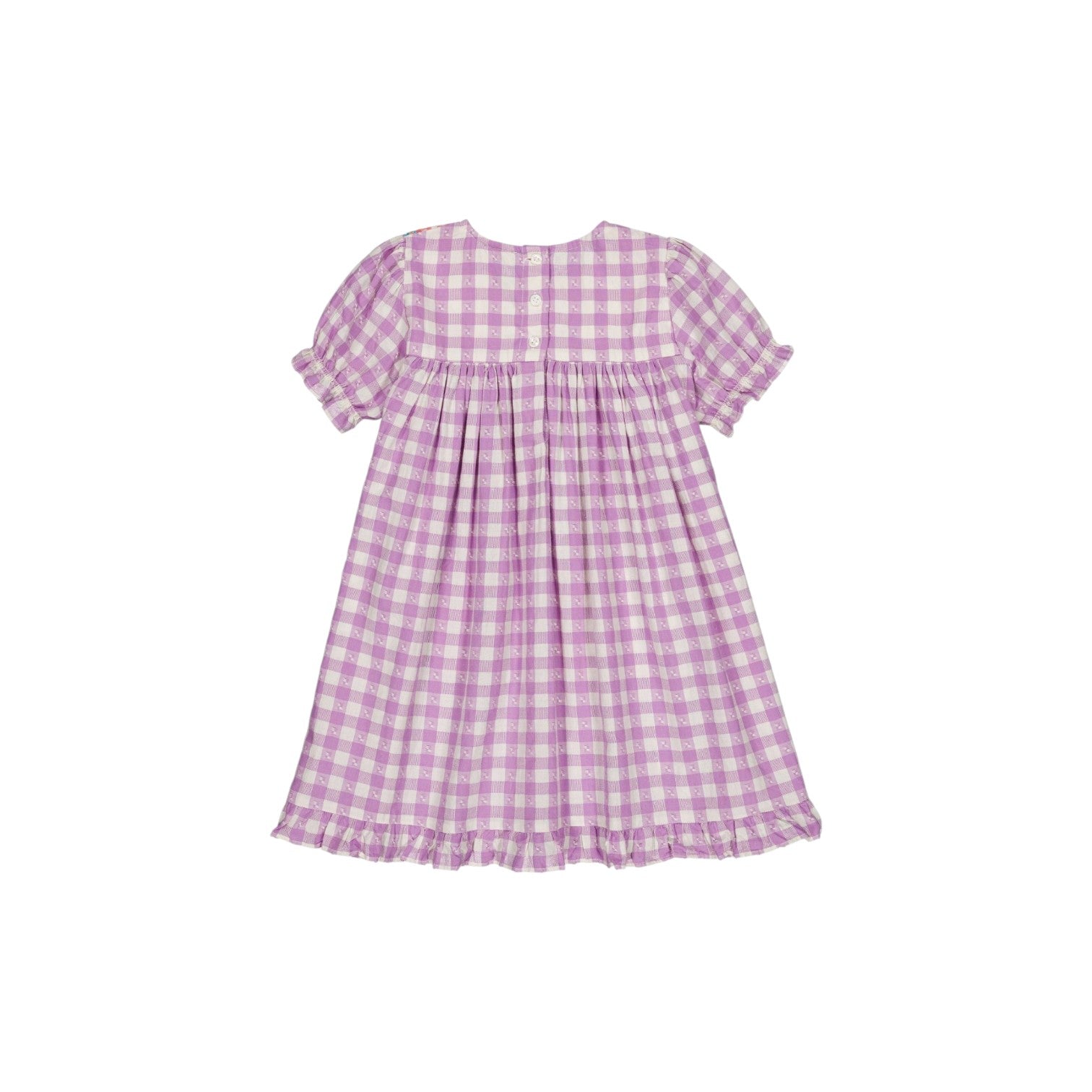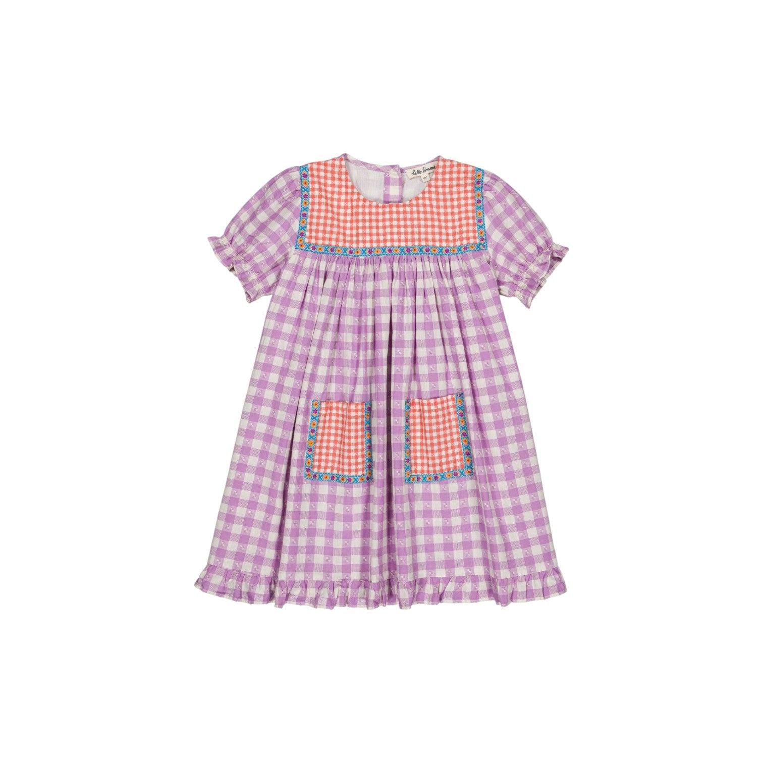 一件格紋連身裙,領口採用撞色格紋布料,下擺有褶襉。兩個撞色前袋,飾有彩色滾邊。短袖,袖口有褶皺和荷葉邊。下擺也有荷葉邊。後背有紐扣。