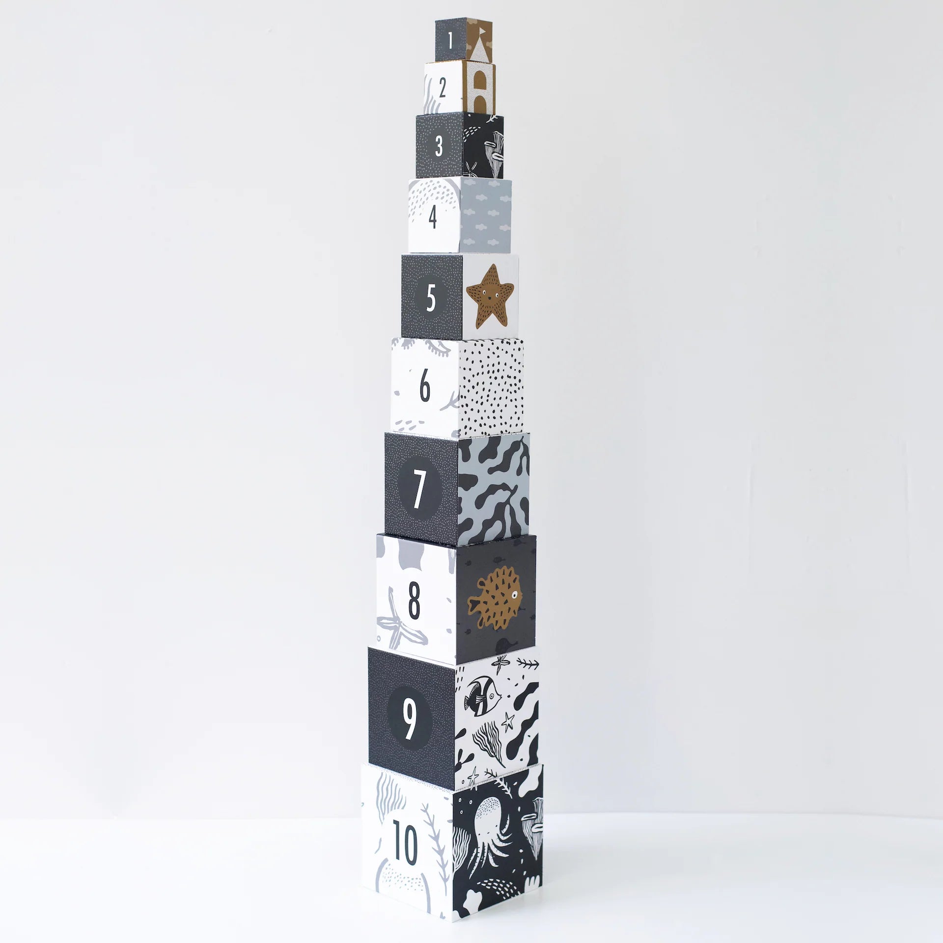 充滿奇思妙想的海洋動物套疊積木能激發幼兒的想像自由。他們可以堆疊玩耍一整天,在探索數字和計數的同時,欣賞高對比度的圖案和插圖。