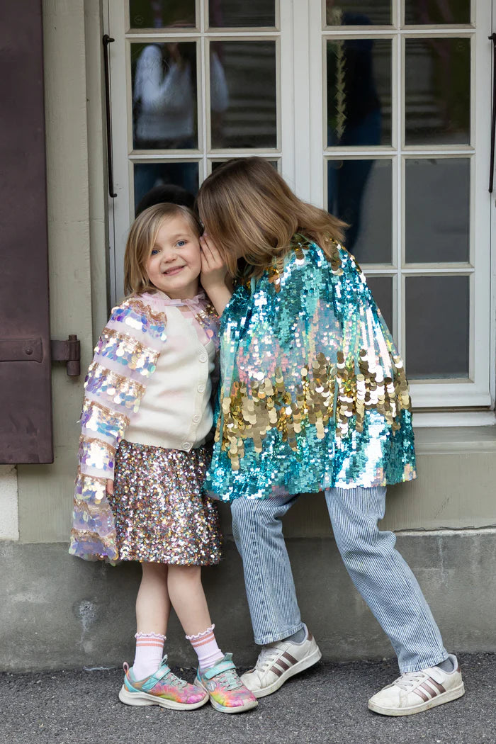 閃耀的亮片交錯排列,在披肩上形成令人驚豔的條紋圖案,隨著孩子的每一個動作都熠熠生輝。交替的亮片營造出柔和而耀眼的效果,而褶皺的薄紗領則增添了一絲精緻的童話氣息。無論是打造夢幻般的造型、參加特別演出,還是僅僅為了享受充滿樂趣的一天,這款披肩都能讓您的孩子光彩奪目。