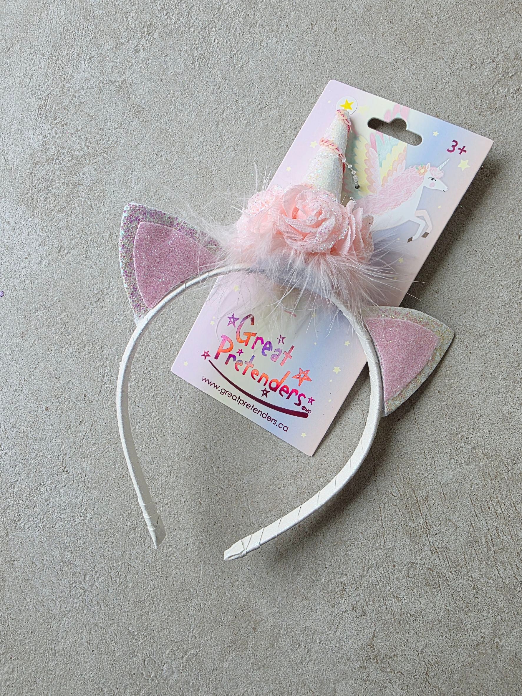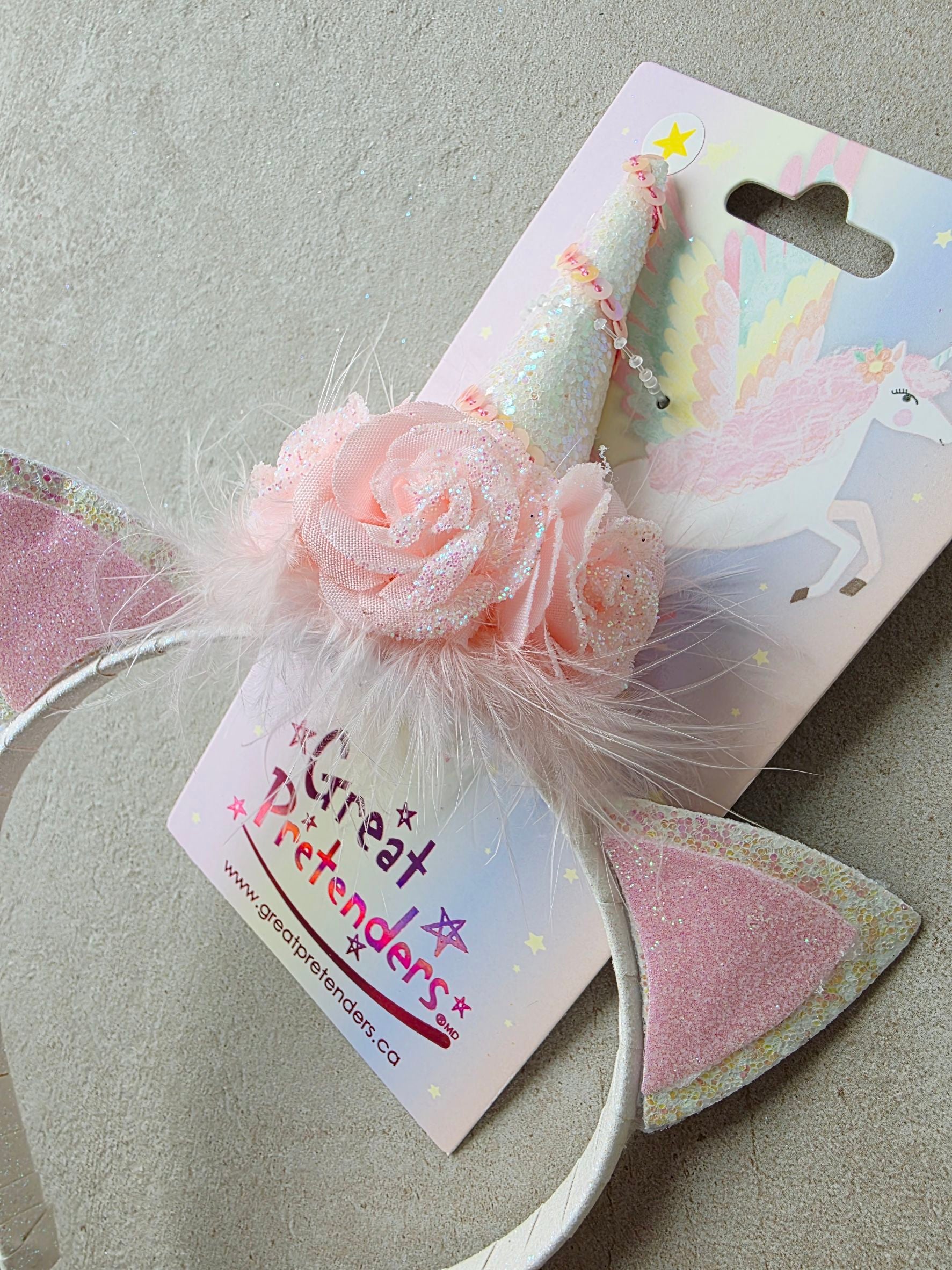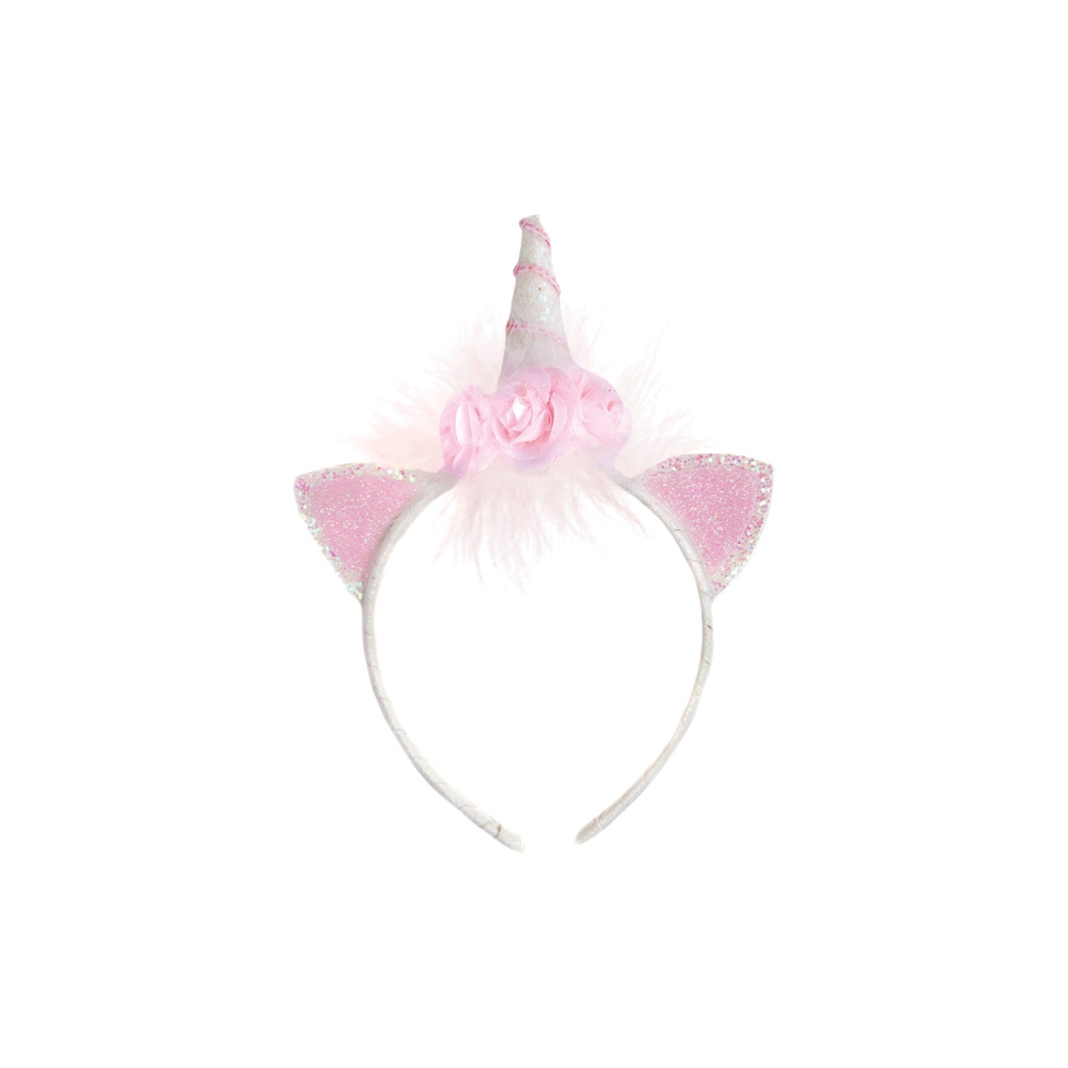 假裝自己是獨角獸一天吧!這款粉白相間的獨角獸髮箍,絕對是打造獨角獸造型的必備單品。閃亮的粉紅色耳朵、柔軟的馬毛飾邊和粉紅色玫瑰,共同組成一個帶有粉紅色亮片的夢幻獨角獸角。