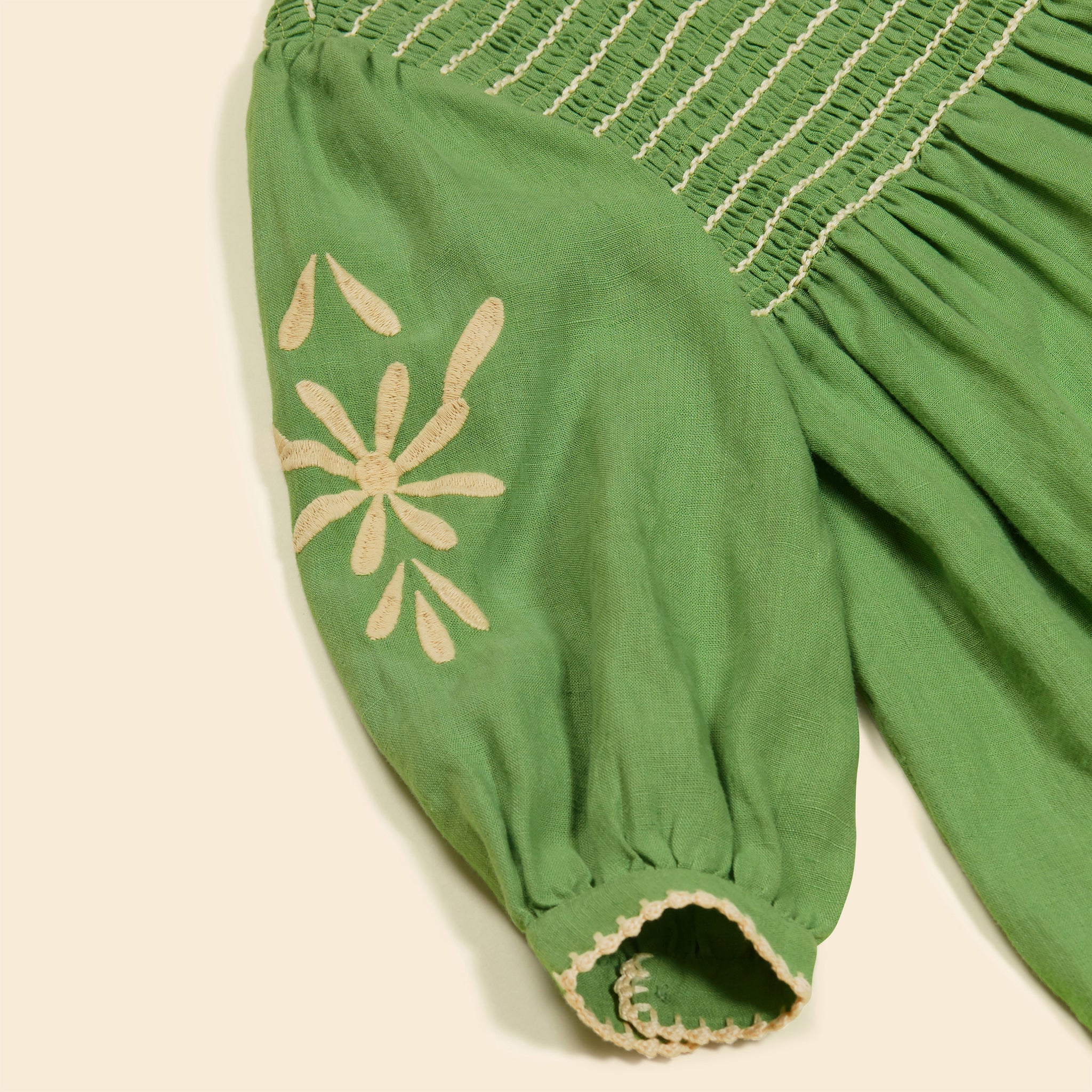 這款 Noemie 連身裙採用我們精美的復古綠亞麻面料,堪稱經典之作。胸前飾有手工褶飾,裙擺和袖口飾有 Apolina 標誌性撞色刺繡圖案。袖口和領口飾有撞色手工鉤編飾邊。後背採用隱形拉鍊開合。