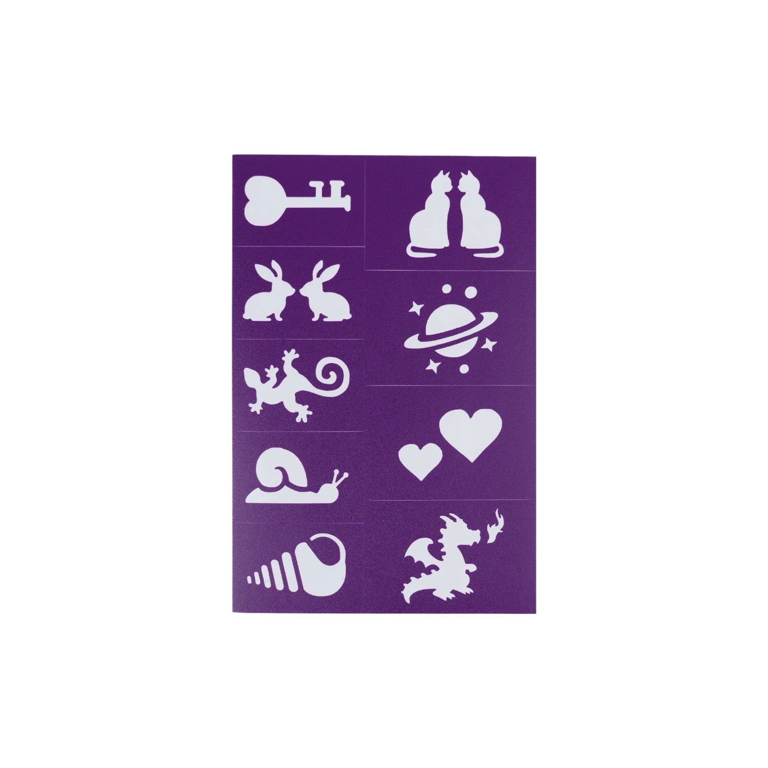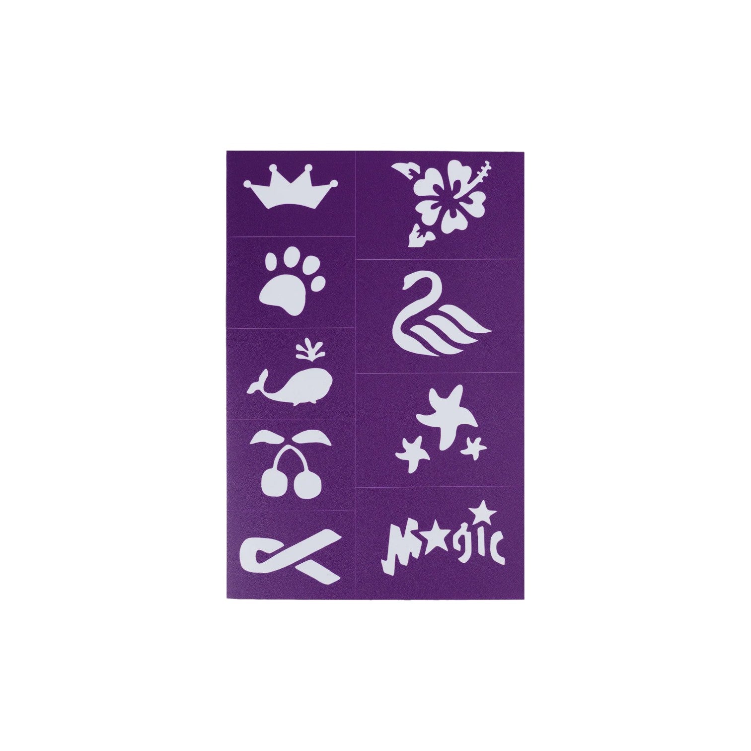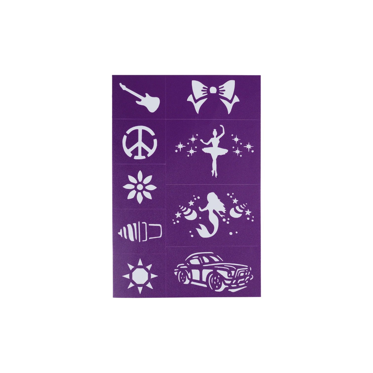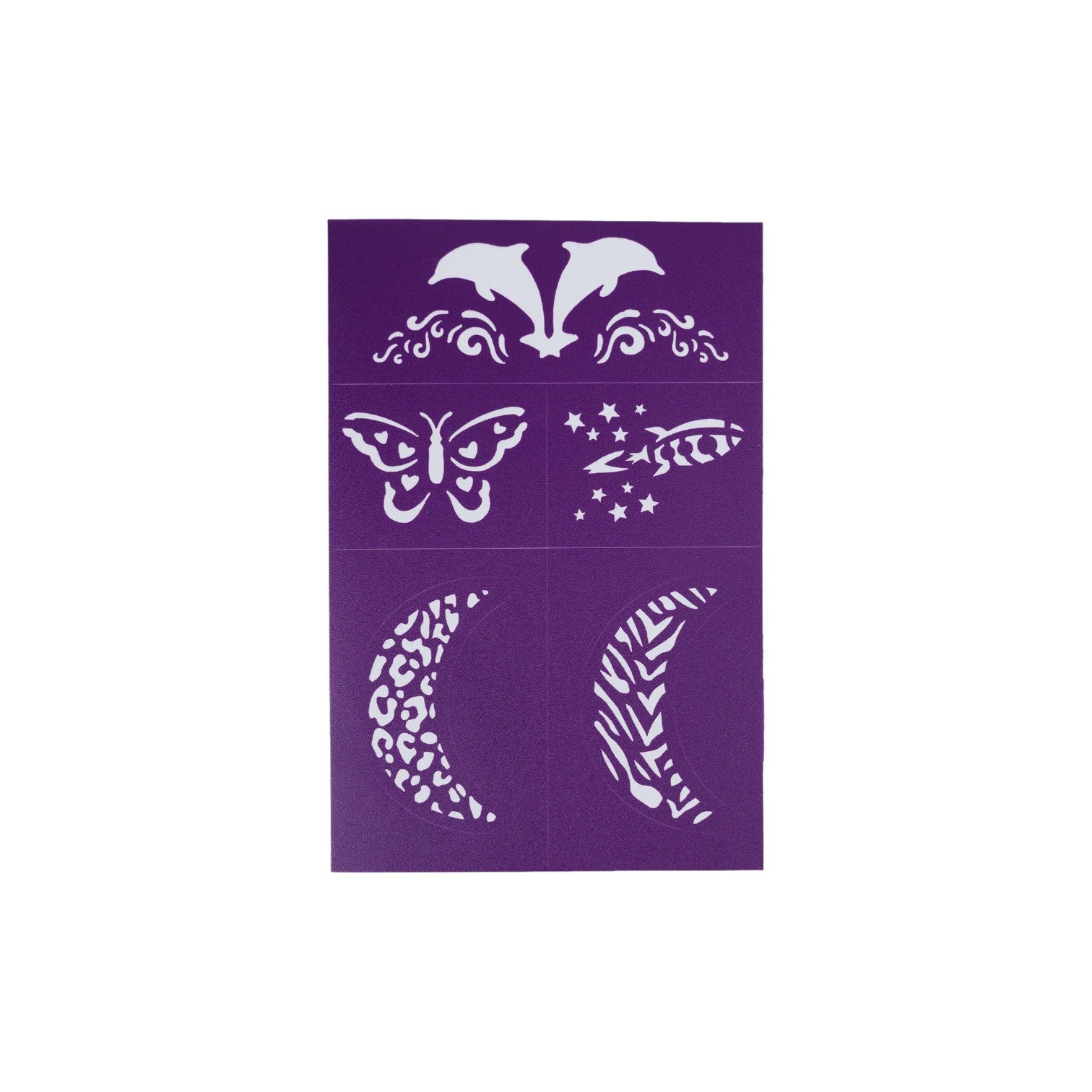 無毒、可重複使用的兒童臉部彩繪和化妝模板是玩耍時必備的!套裝包含六張多種圖示的模板,共有 40 種趣味十足、精美絕倫的圖案,包括動物、汽車、火箭、芭蕾舞者等等!也附贈眼部彩繪範本。非常適合兒童角色扮演遊戲!