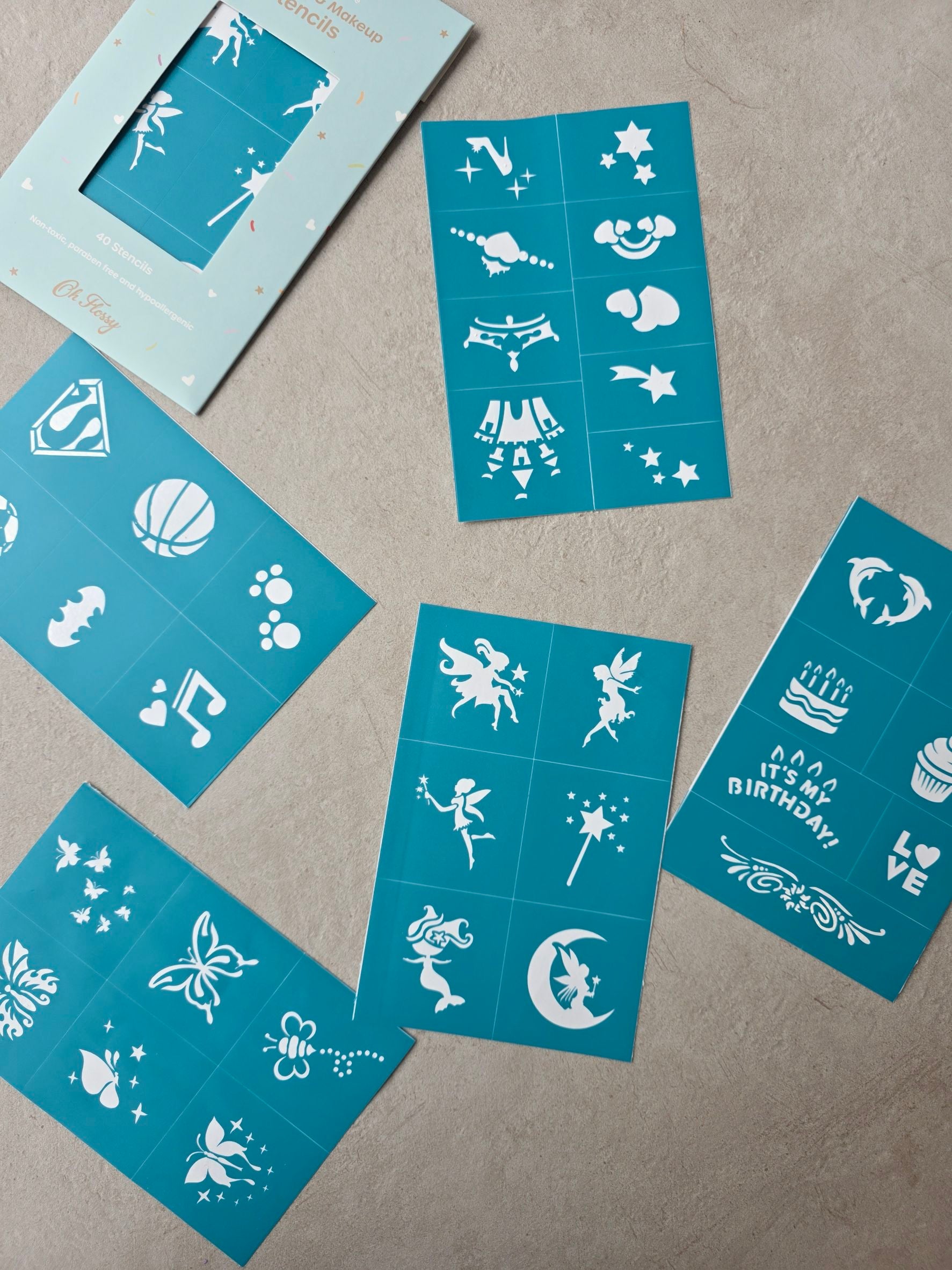 無毒、可重複使用的兒童臉部彩繪和化妝模板是玩耍時必備的!套裝包含六張多種圖示的模板,共有 40 種趣味十足、精美絕倫的圖案,包括蝴蝶、恐龍、運動、仙女等等!也附贈眼部彩繪範本。非常適合兒童角色扮演遊戲!