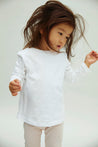圓領經典長袖T,下擺圓弧線條,單穿或是搭配大學T、外套都適合,基本百搭款。