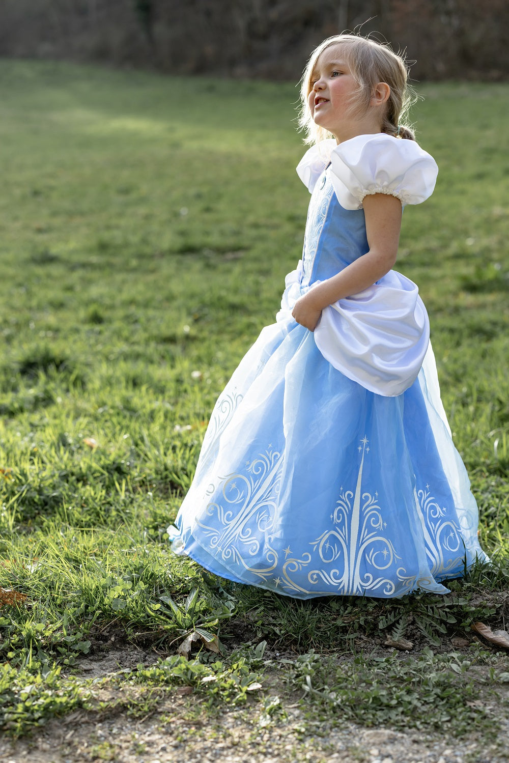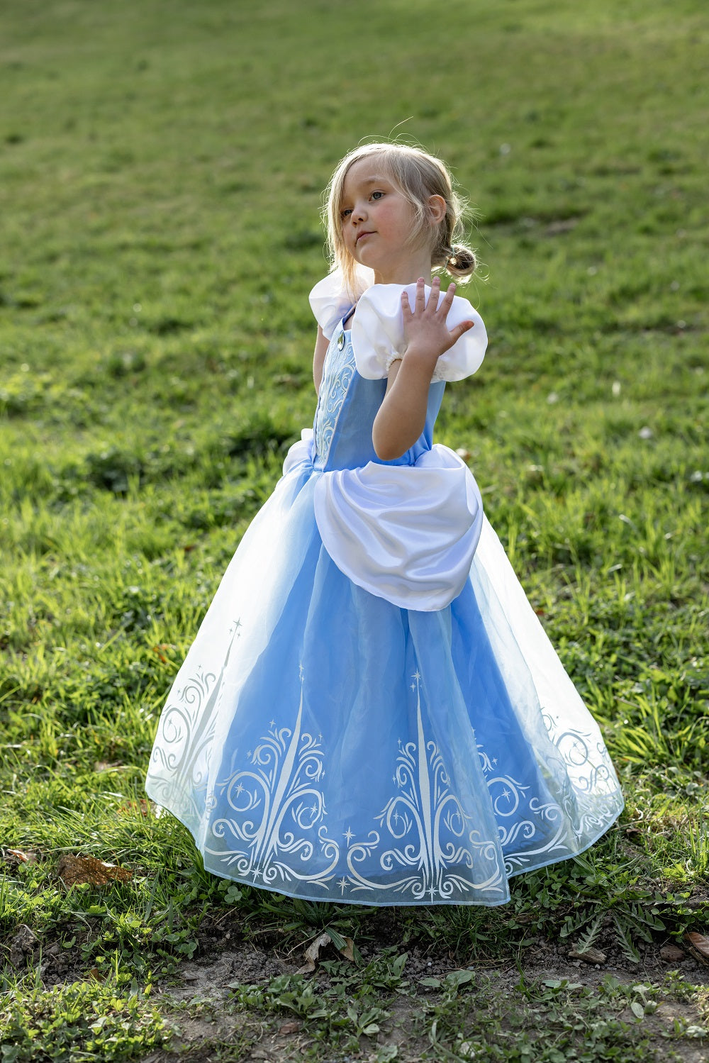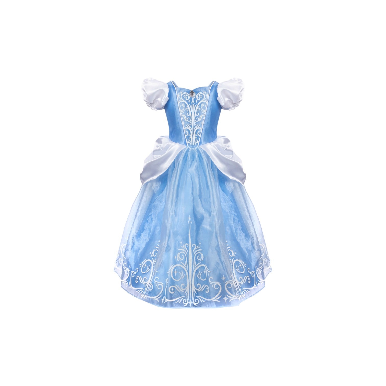 裙子呈現柔和的玫瑰粉紅色,非常適合在花園、城堡或奇幻冒險中翩翩起舞。蓬蓬袖增添了經典的公主風情,而精緻的白色荷葉邊領口則從領口探出,為整件連身裙賦予了高貴典雅的氣質。
