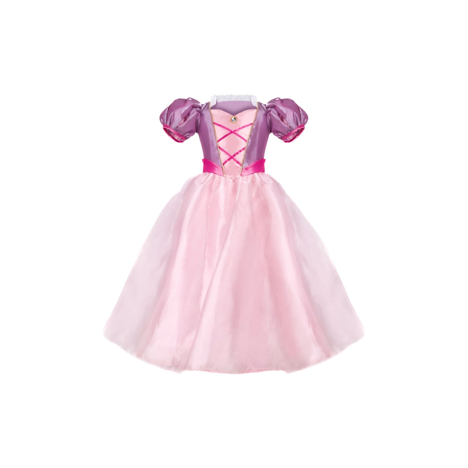 裙子呈現柔和的玫瑰粉紅色,非常適合在花園、城堡或奇幻冒險中翩翩起舞。蓬蓬袖增添了經典的公主風情,而精緻的白色荷葉邊領口則從領口探出,為整件連身裙賦予了高貴典雅的氣質。