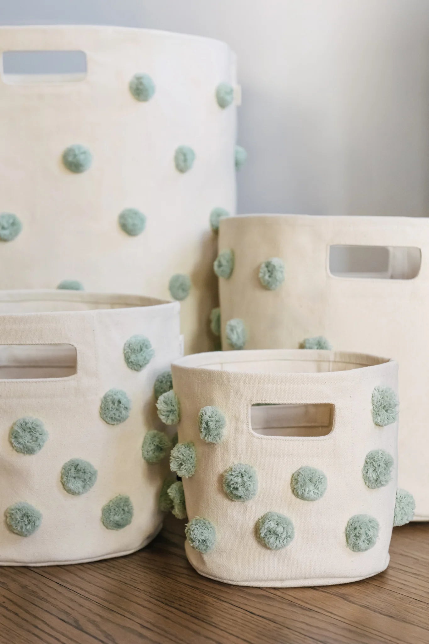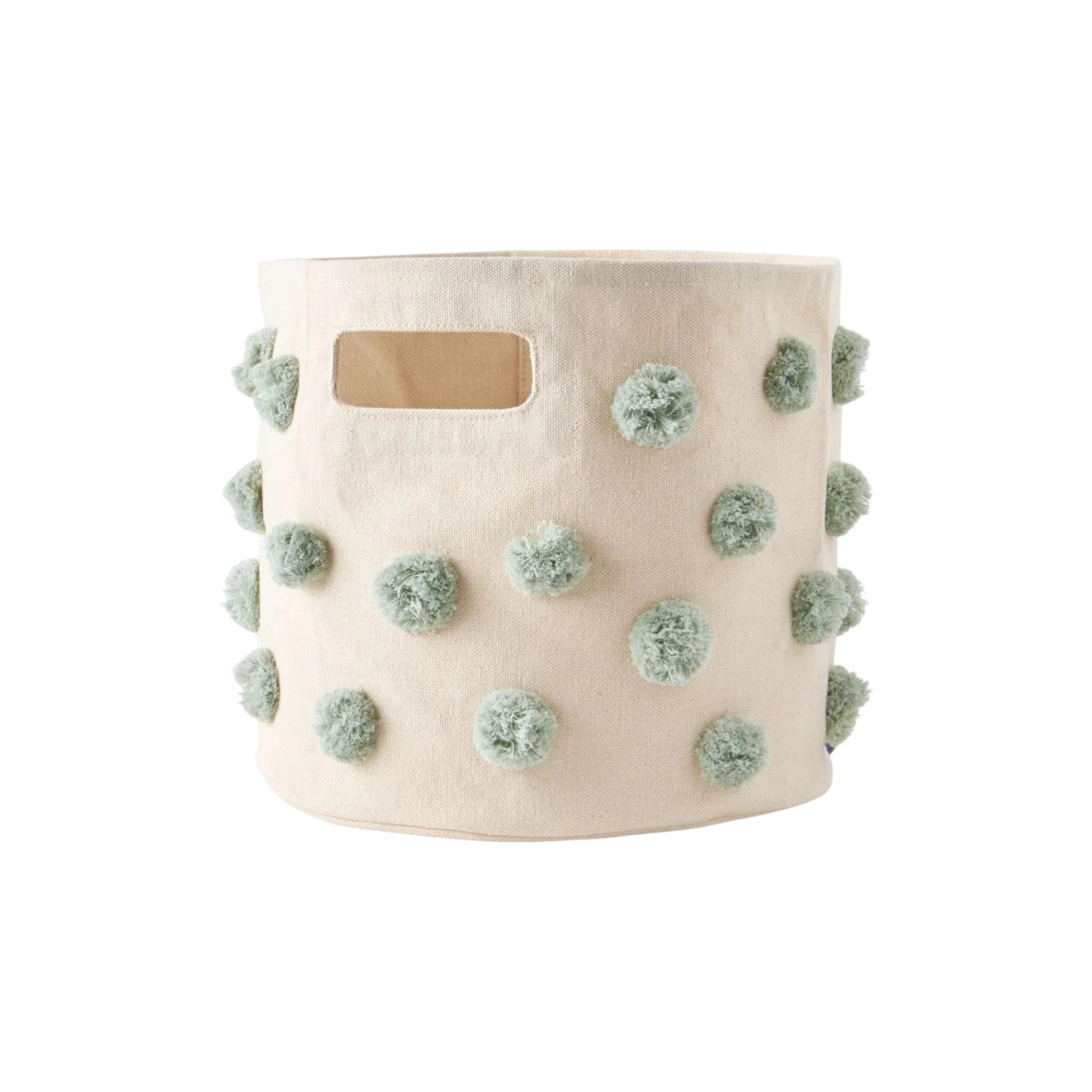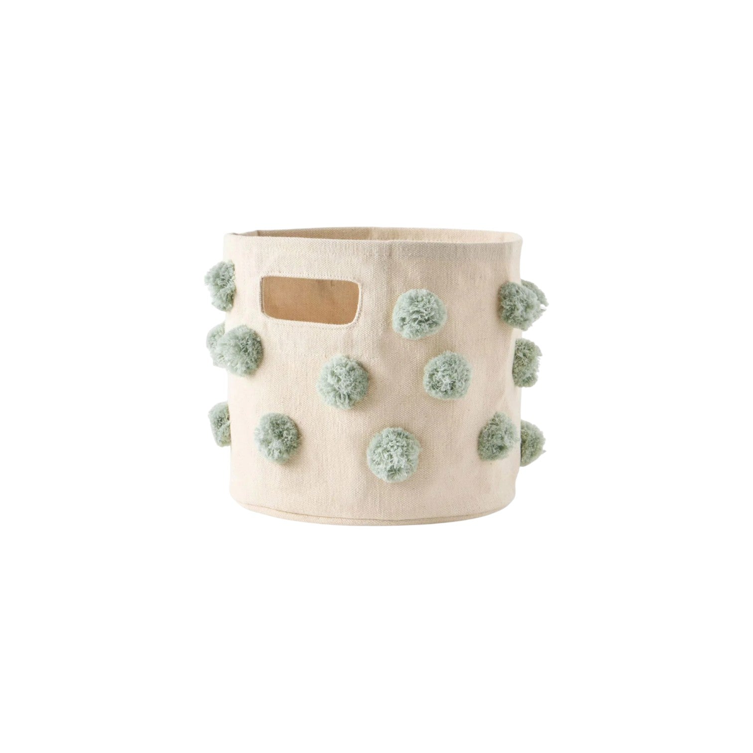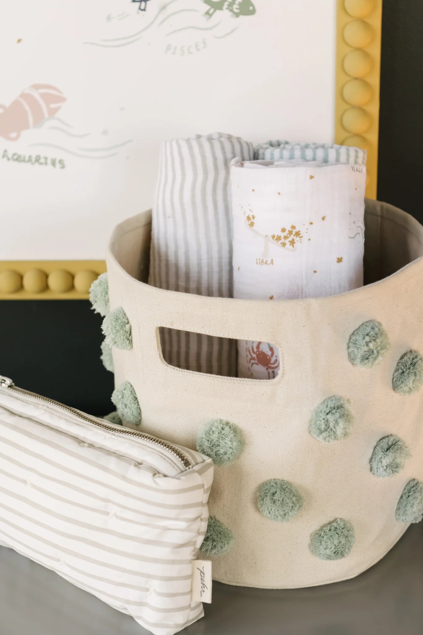 自帶可愛的收納籃,有立體手工製作的絨毛球,不規則的裝飾在上面,輕易融入家裡任何一個空間,為其增添收納功能。收納籃配有手把設計,方便您隨意移動整理,無論是在嬰兒房整理尿布、在遊戲室收納玩具,或是在家中裝飾置物架,這款收納籃都兼具實用性與美觀。