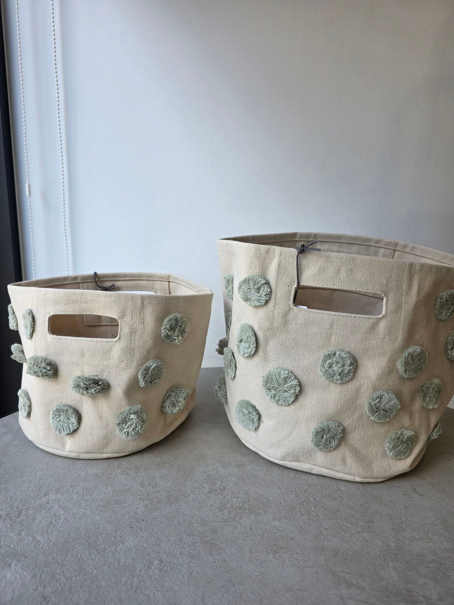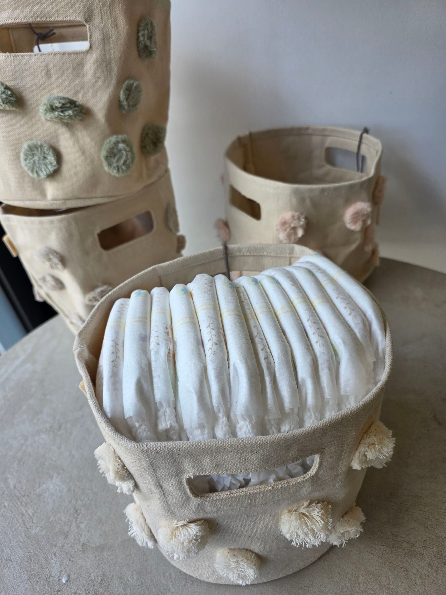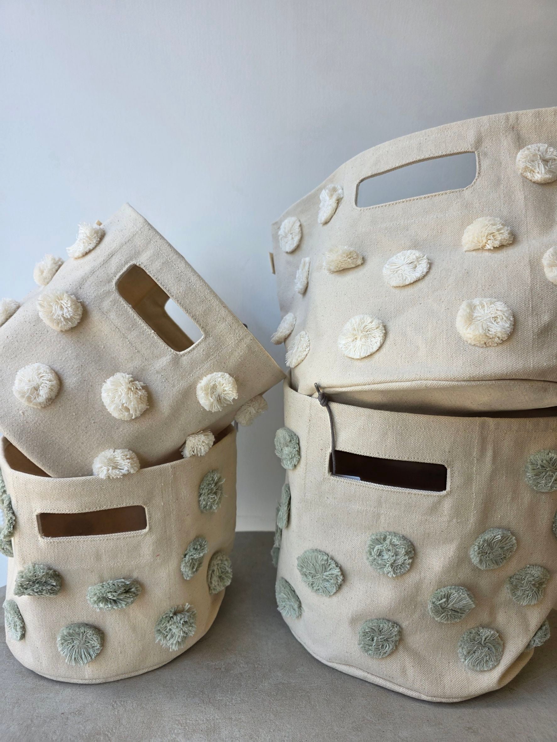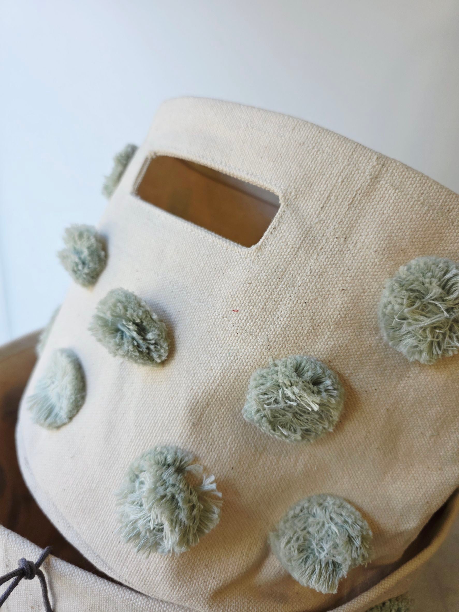 自帶可愛的收納籃,有立體手工製作的絨毛球,不規則的裝飾在上面,輕易融入家裡任何一個空間,為其增添收納功能。收納籃配有手把設計,方便您隨意移動整理,無論是在嬰兒房整理尿布、在遊戲室收納玩具,或是在家中裝飾置物架,這款收納籃都兼具實用性與美觀。