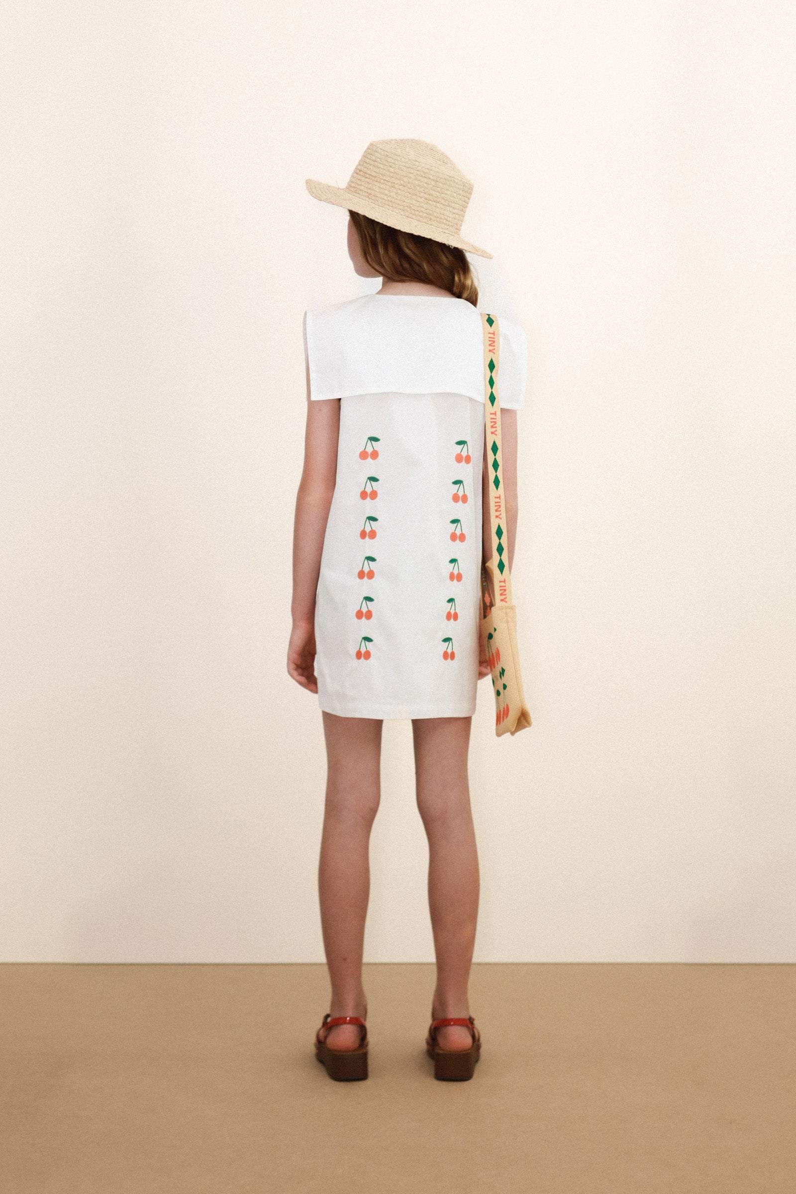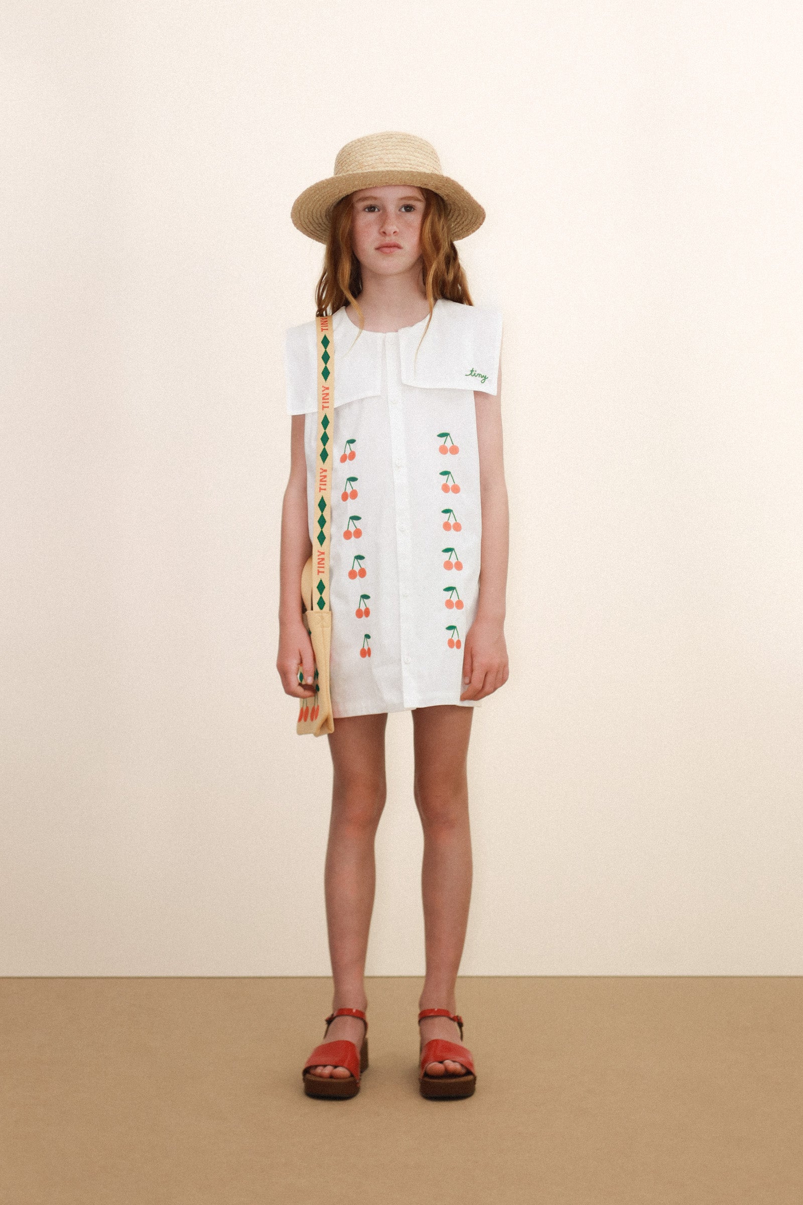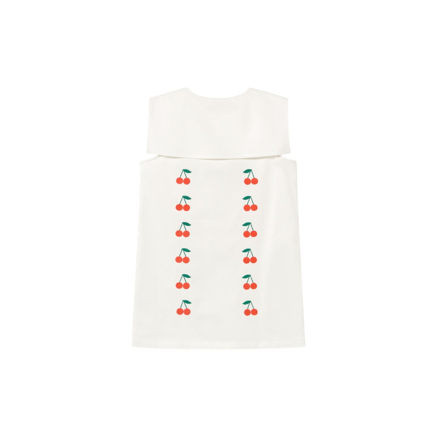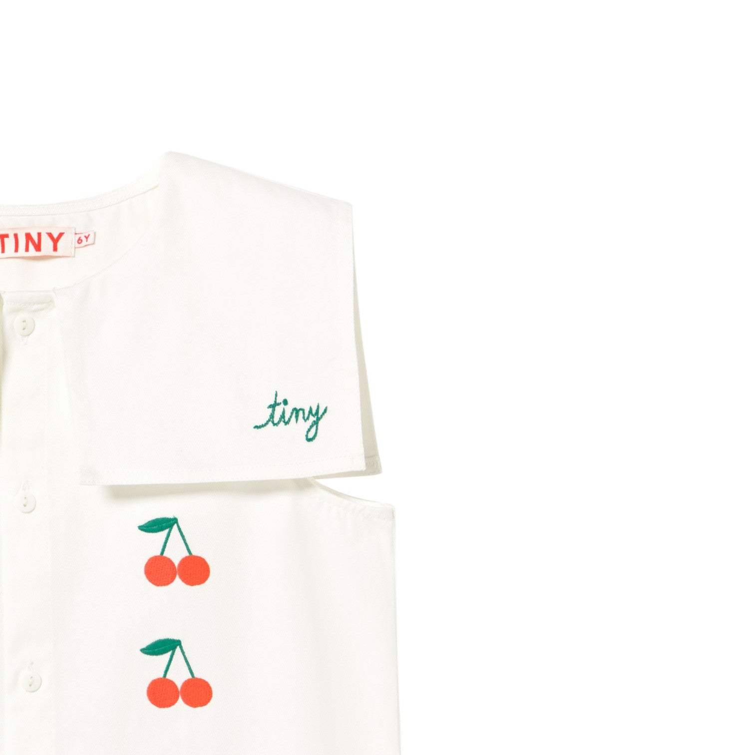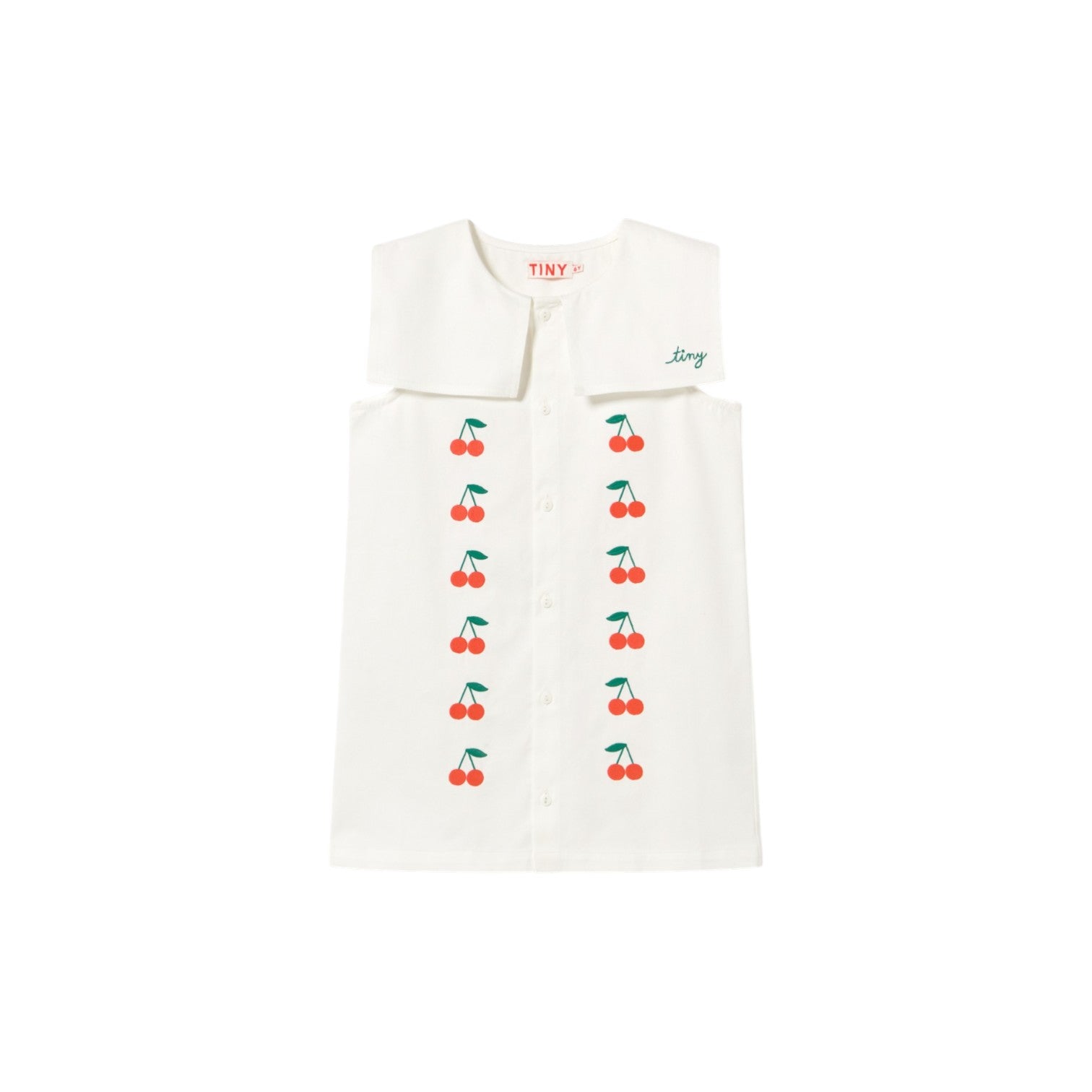 這款短洋裝採用柔和的中斜紋布料,以米白色為底色,飾以迷你櫻桃刺繡,經典設計中又不失精緻細膩。正面紐扣開合設計一直延伸至下擺,搭配方形水手領,更添優雅迷人氣質,適合各種場合。